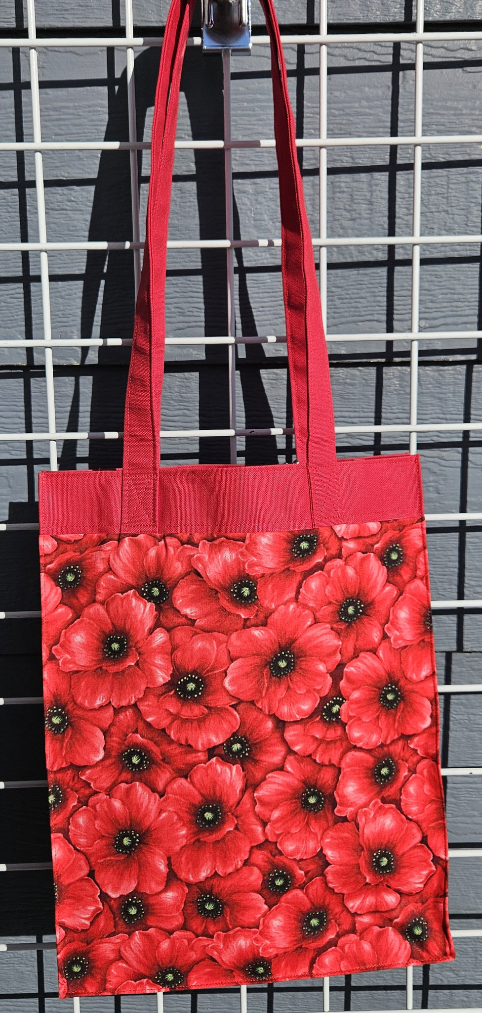 This bag measures approximately 15" tall, 12" wide, with a 4" [bottom] depth.  Sturdy cotton fabric straps are comfortable on your hands and shoulders. 35" straps are great for wearing on your shoulder! Totes are 100% cotton and fully machine washable.