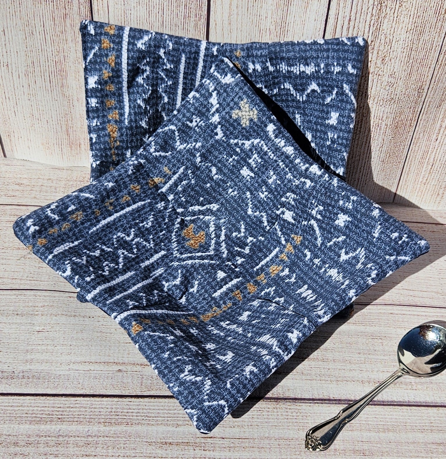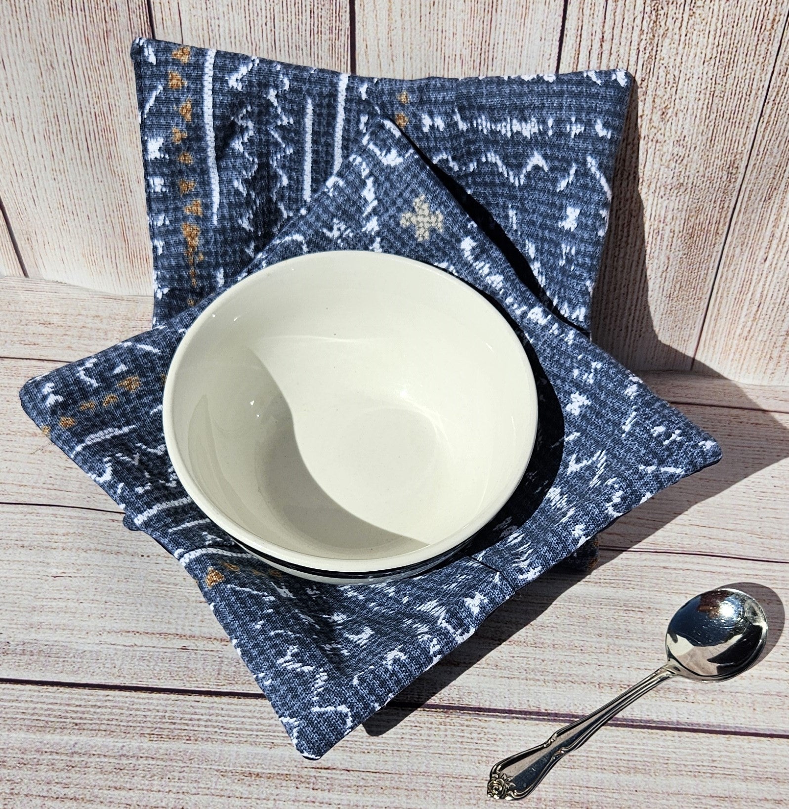 Our design is non-reactive in the microwave, and features tops constructed with sturdy cotton canvas, cotton denim, or cotton corduroy, and the bottoms are double-faced cotton quilted fabric. This creates a durable, washable, and beautiful bowl cozy that lasts for years no matter how many times they are washed.