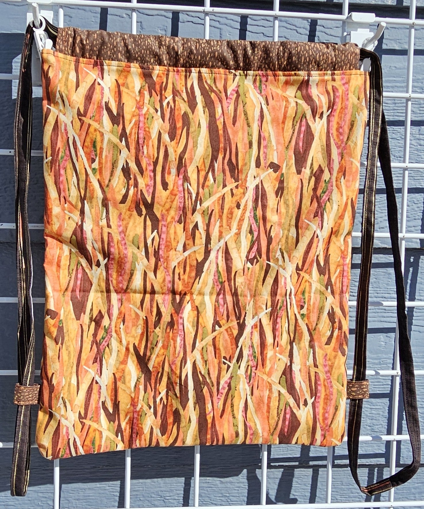 As with all of our drawstring totes, the fabric selection is one-of-a-kind. The bag is 12.5" wide and 14" tall. The interior contains a cell phone friendly pocket to keep your phone close at hand.