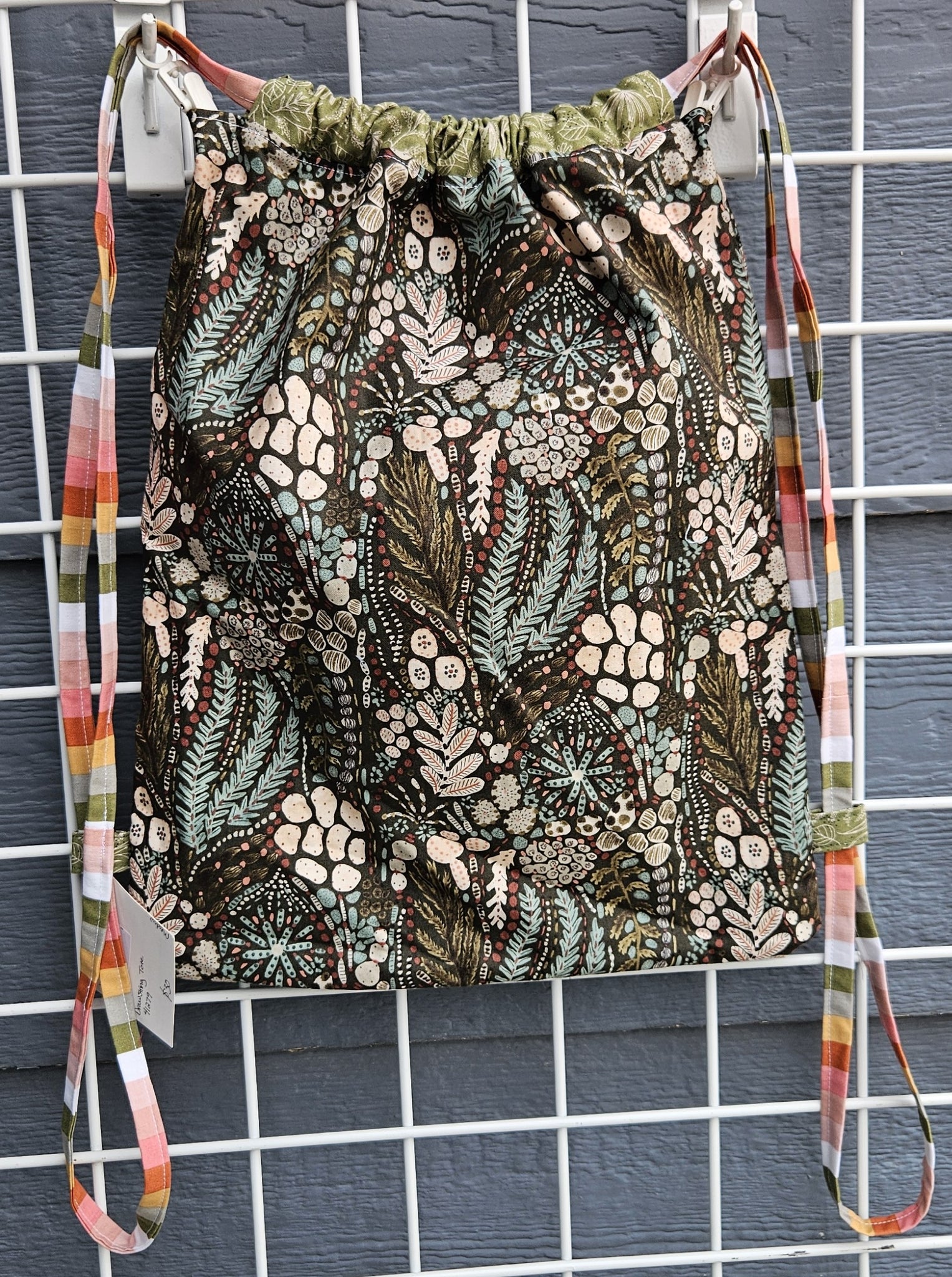 As with all of our drawstring totes, the fabric selection is one-of-a-kind. The bag is 12.5" wide and 14" tall. The interior contains a cell phone friendly pocket to keep your phone close at hand.