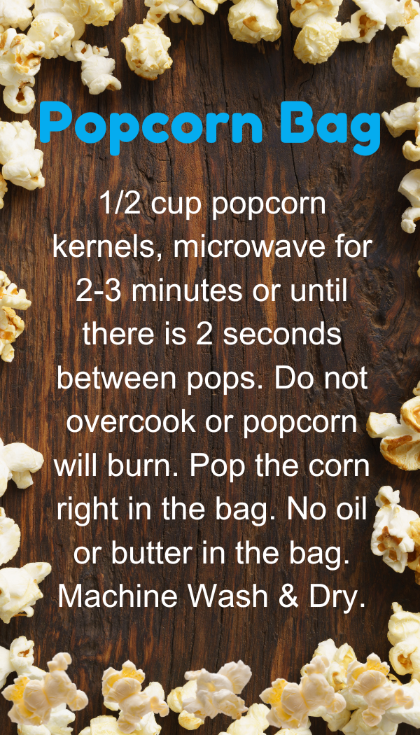 Sustainable, all-cotton reusable microwave popcorn bag. Place 1/4 cup popcorn kernels in bag, fold the top over, and pop in the microwave for 2-3 minutes, or until pops are 1-2 seconds apart. When done open the flap and add salt or other seasonings as desired. Eat straight from the bag!